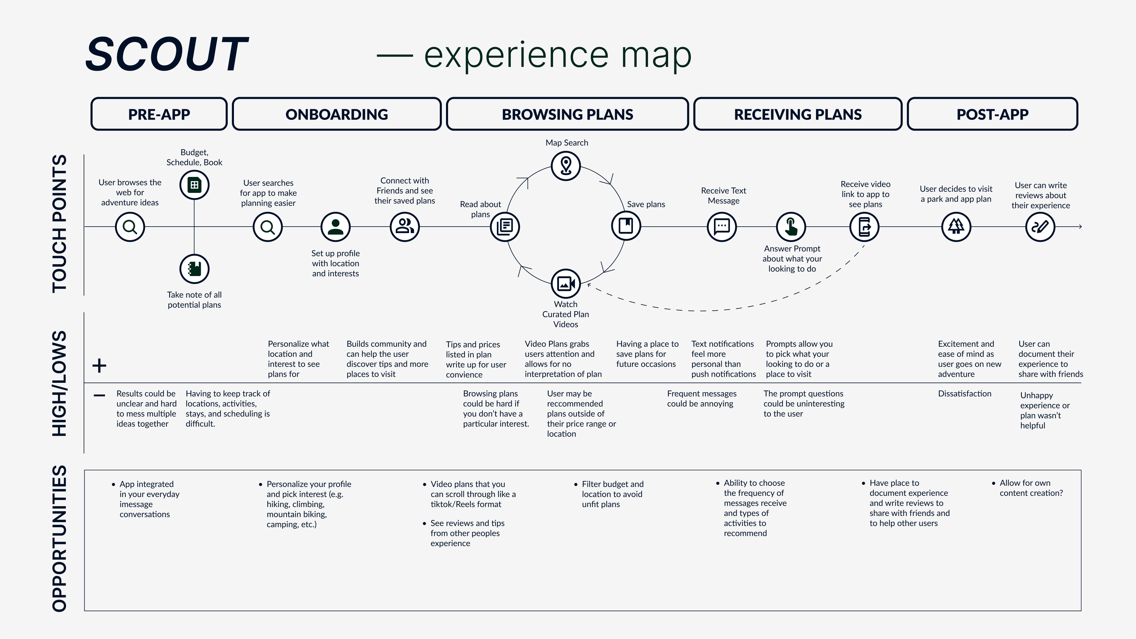 We analyzed competitors by tearing down the information architecture on existing apps and develop a user journey map to identify key audiences, user pain points, and opportunities for improvements.